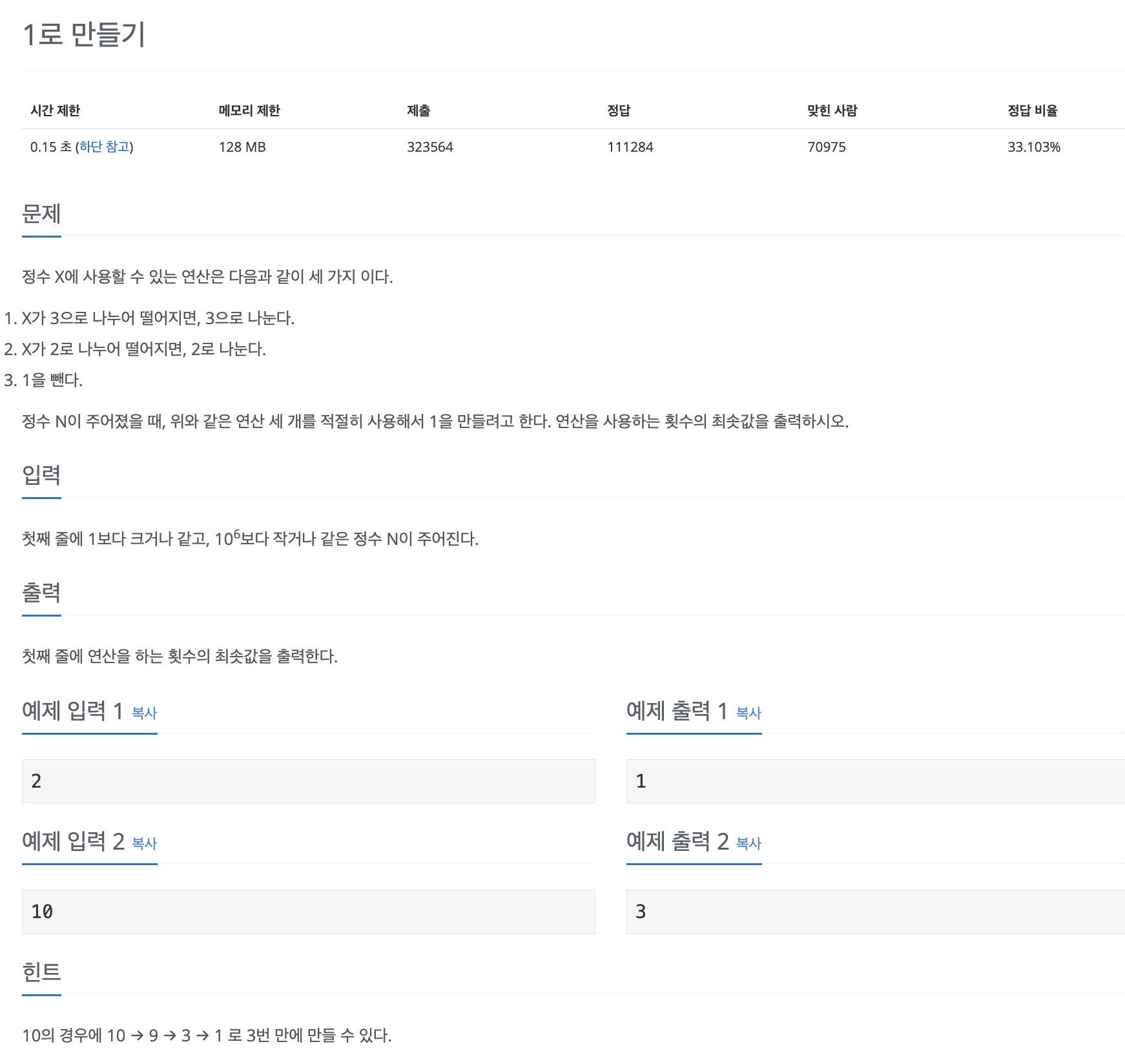 10->1 의 최솟값 = (9->1의 최소 연산 횟수 +1, 5->1의 최소 연산 횟수 +1)의 최소값