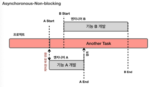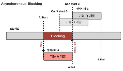 기능 A가 기능 B보다 우선 개발되어야 하므로 엔지니어 A의 작업 종료 시간에 맞춰 엔지니어 B의 작업이 시작된다. - Non-Blocking