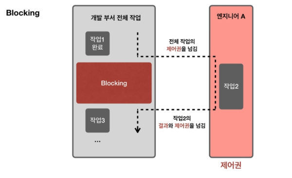 Blocking의 경우, 개발 부서 전체 작업의 제어권을 가진 팀장이 엔지니어 A에게 제어권을 넘긴다.