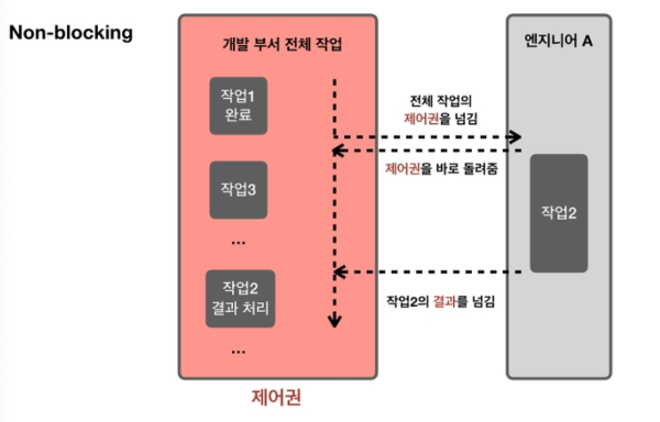 Non-Blocking의 경우, 엔지니어 A이 제어권을 받자마자 제어권을 다시 팀장에게 돌려준다.