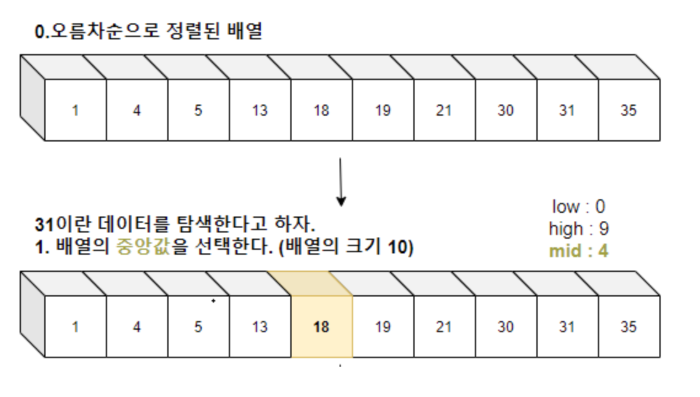 길이가 10인 오름차순으로 정렬된 배열이 있다고 하자. 31 이란 특정한 값의 위치를 찾고자한다.