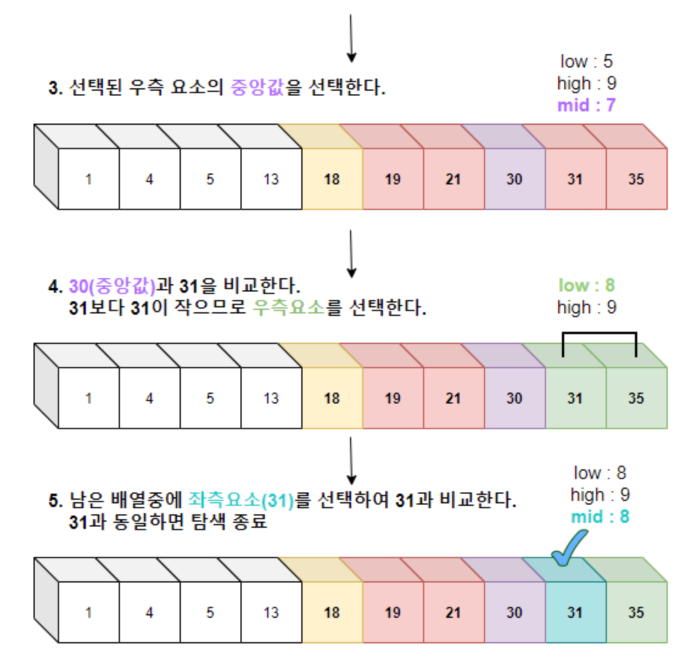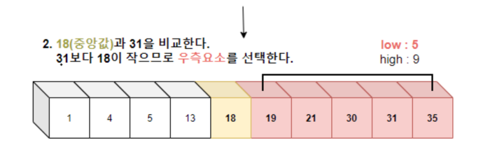 설정된 중앙값(mid)가 31보다 작으므로, low의 인덱스를 mid+1로 설정하여 우측을 선택한다.