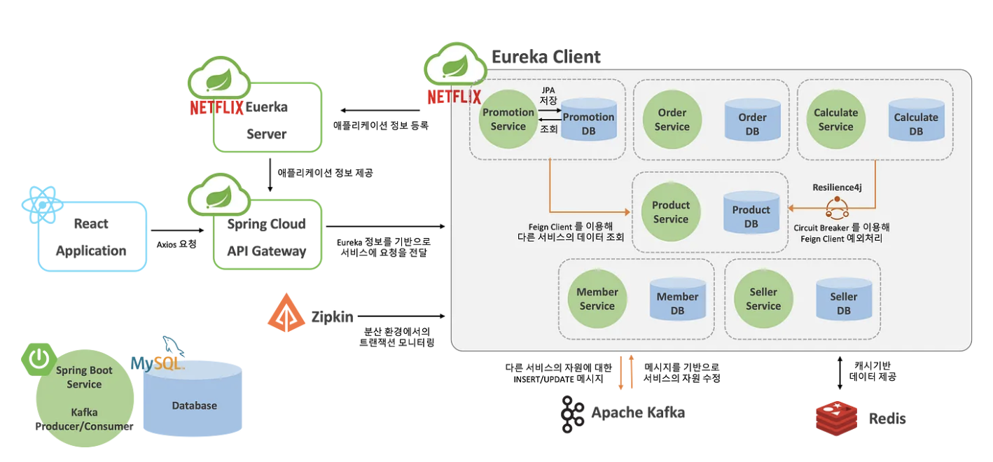 | Eureka Client | 각 마이크로 서비스는 Eureka Client로 동작하며, Eureka Server에 등록하고 정보를 조회함. |