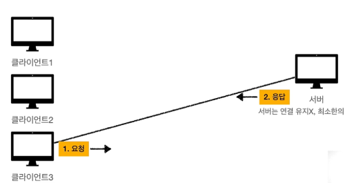클라이언트가 필요로 할 때만 연결을 하고 필요없는 경우 연결을 끊음. 즉 서버 연결을 유지하지 않는 경우