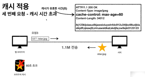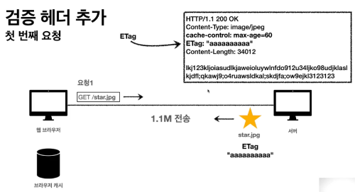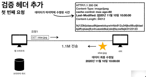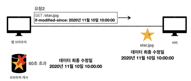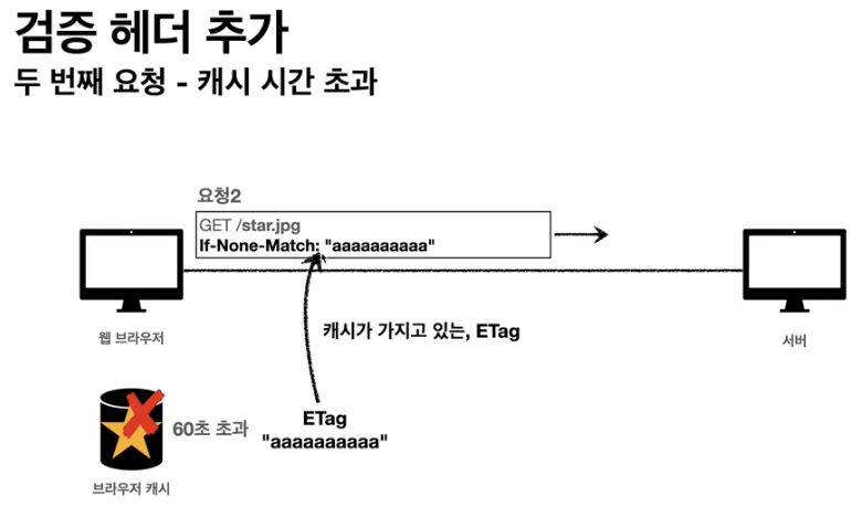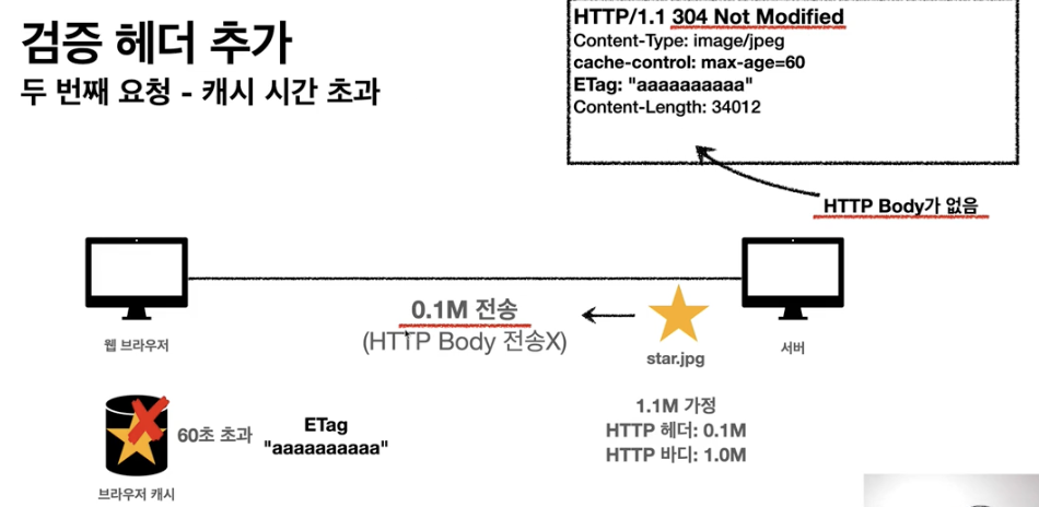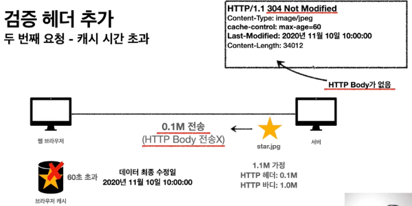 - 캐시 유효 시간이 초과해도, 서버의 데이터가 갱신되지 않으면 304 Not Modified+ 헤더 메타 정보만 응답(바디 x)
