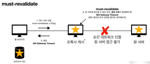 must-revalidate : 원 서버 접근이 불가능한 경우 504 Gateway Timeout을 보냄.