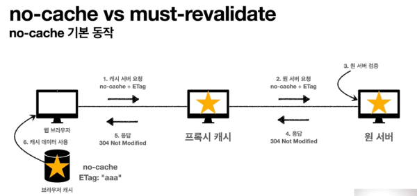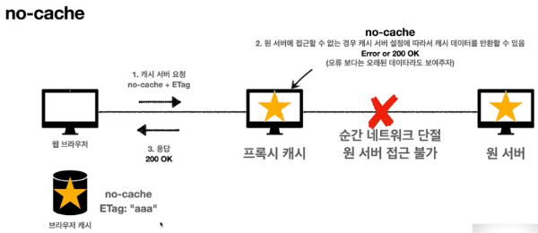 no-cache : 원 서버 접근이 불가능한 경우 프록시 캐시에서 오래된 데이터라도 보내주는 경우 존재.