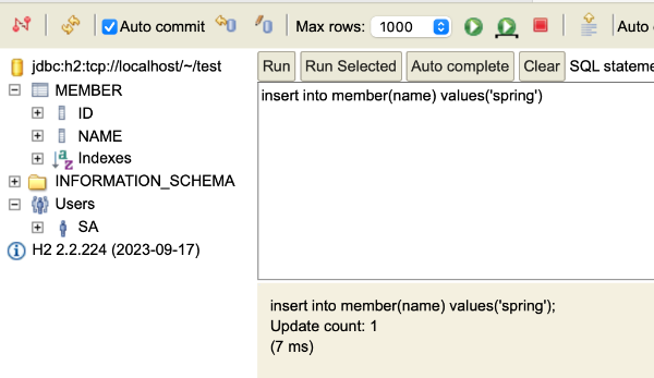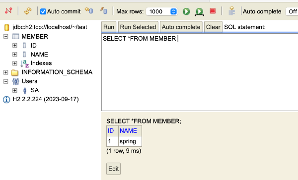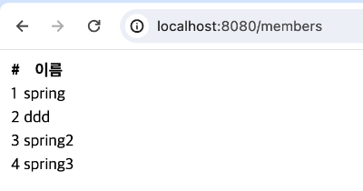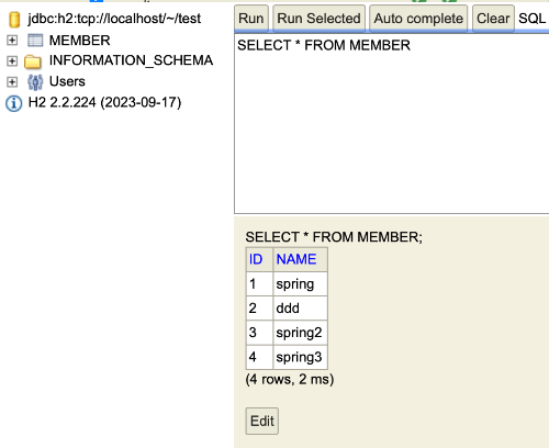 localhost:8080에서 "spring2"의 이름으로 회원가입을 하고나면 db에 저장되는 것을 확인할 수 있다.