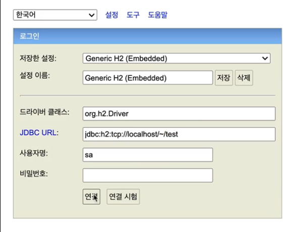 JDBC URL에 jdbc:h2:tcp://localhost/~/test을 적어, 소켓을 통해 접속하는 방식을 활용한다.