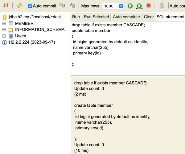 이 코드를 치고 실행시키면 MEMBER라는 db가 생성된다.