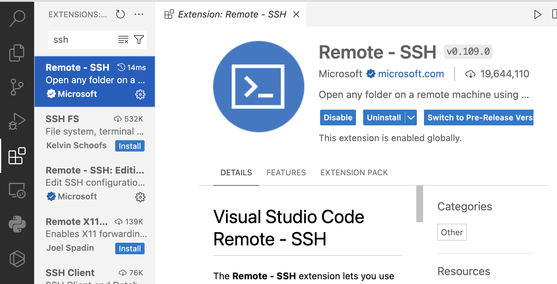 vs code 내에서 확장자 Remote-SSH를 설치해준다.
