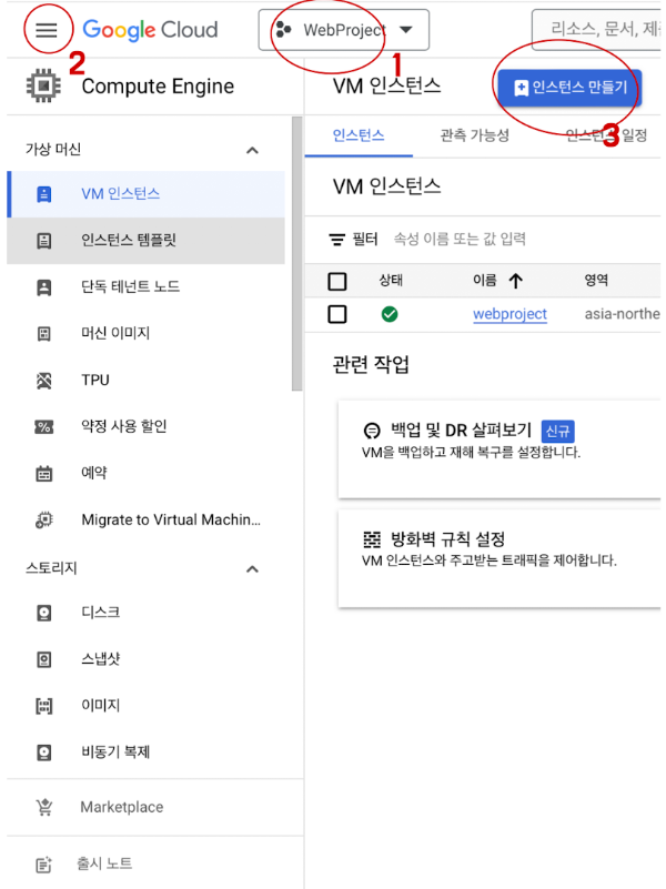 2. 좌측 상단 메뉴에서 "ComputeEngine > VM인스턴스" 선택