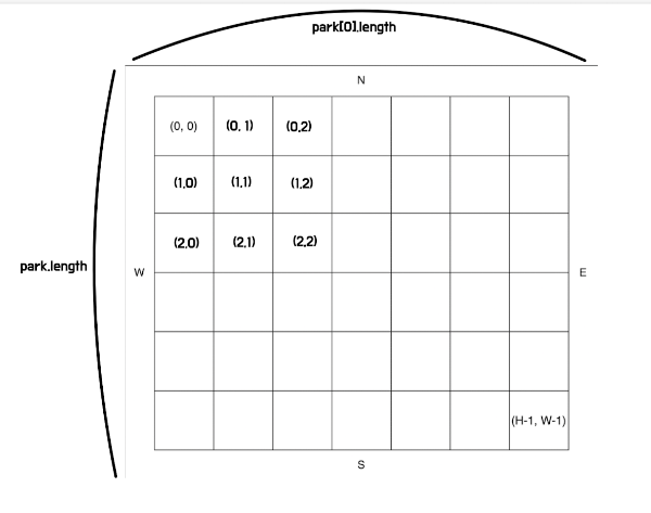 공원의 가로 길이가 W, 세로 길이가 H라고 할 때, 공원의 좌측 상단의 좌표는 (0, 0), 우측 하단의 좌표는 (H - 1, W - 1) 입니다.