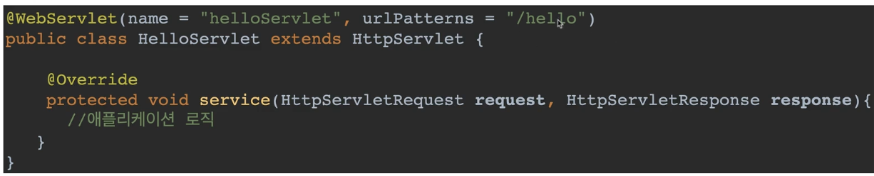 - urlPatterns(/hello)의 URL이 호출되면 서블릭 코드가 실행