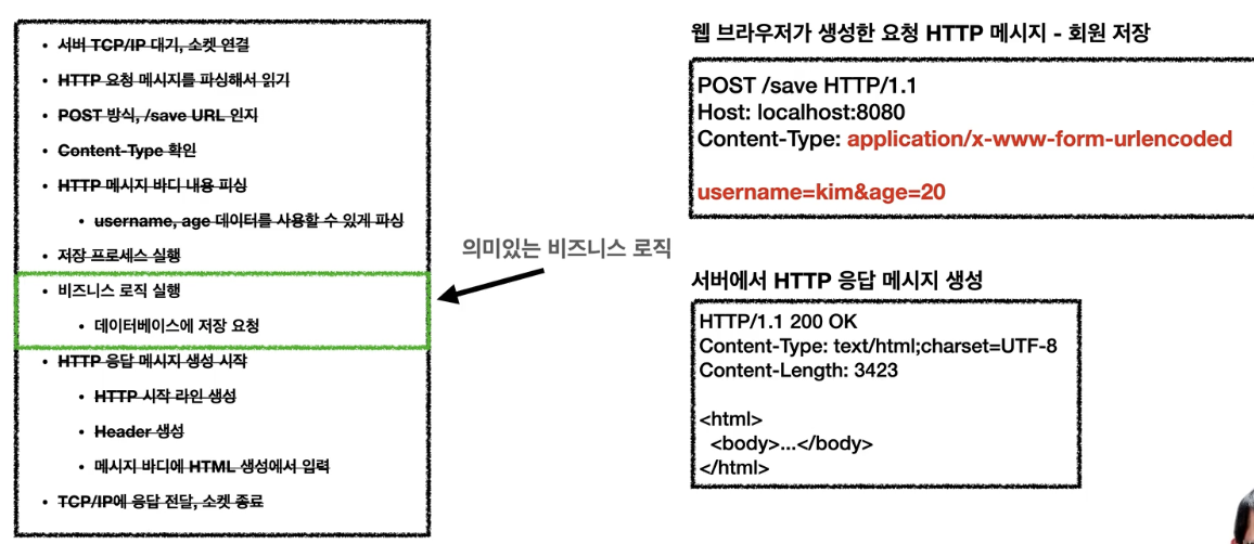 - Servlet : 의미 있는 비즈니스 로직을 제외한 로직들을 지원해주는(자동화) 기능