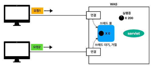 - 최대 쓰레드가 모두 사용중이어서 쓰레드 풀에 쓰레드가 없으면?