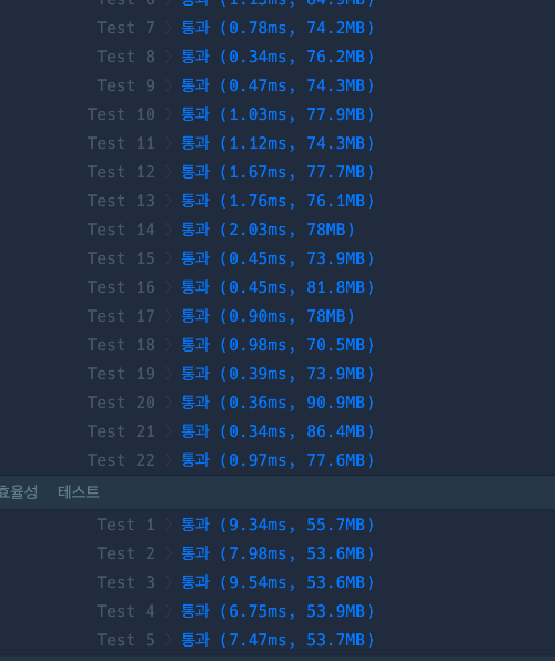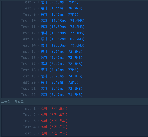 일단 일반 테스트 효율성도 너무 떨어지고, 효율성 테스트도 떨어졌다..