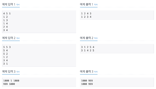 첫째 줄에 정점의 개수 N(1 ≤ N ≤ 1,000), 간선의 개수 M(1 ≤ M ≤ 10,000), 탐색을 시작할 정점의 번호 V가 주어진다. 다음 M개의 줄에는 간선이 연결하는 두 정점의 번호가 주어진다. 어떤 두 정점 사이에 여러 개의 간선이 있을 수 있다. 입력으로 주어지는 간선은 양방향이다.
