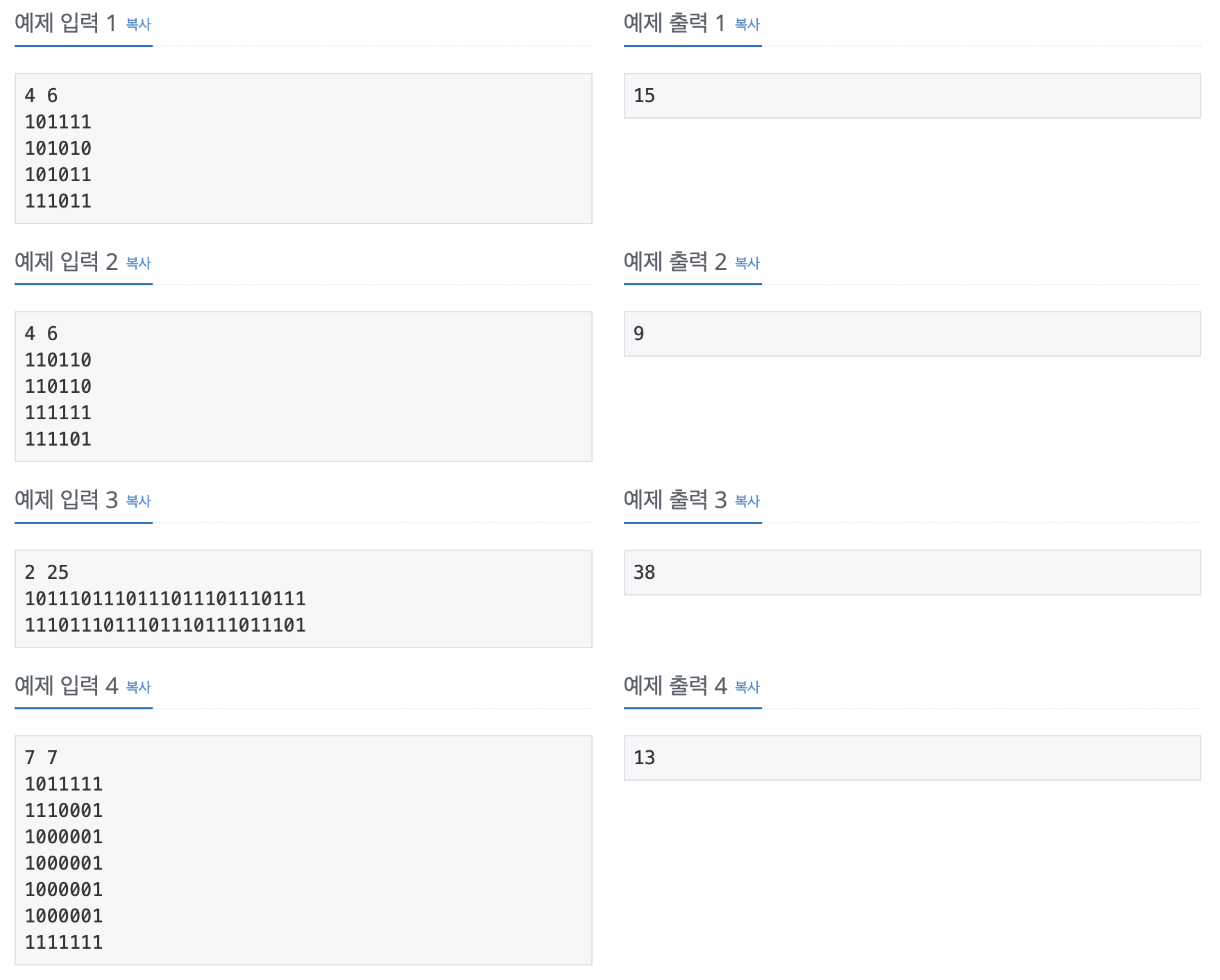 첫째 줄에 두 정수 N, M(2 ≤ N, M ≤ 100)이 주어진다. 다음 N개의 줄에는 M개의 정수로 미로가 주어진다. 각각의 수들은 붙어서 입력으로 주어진다.