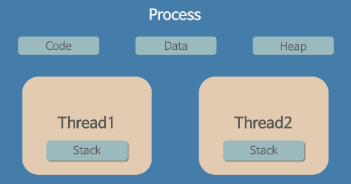 - 스레드는 프로세스 내에서 각각 stack만 따로 할당 받고 Code, Data, Heap 영역은 공유한다.